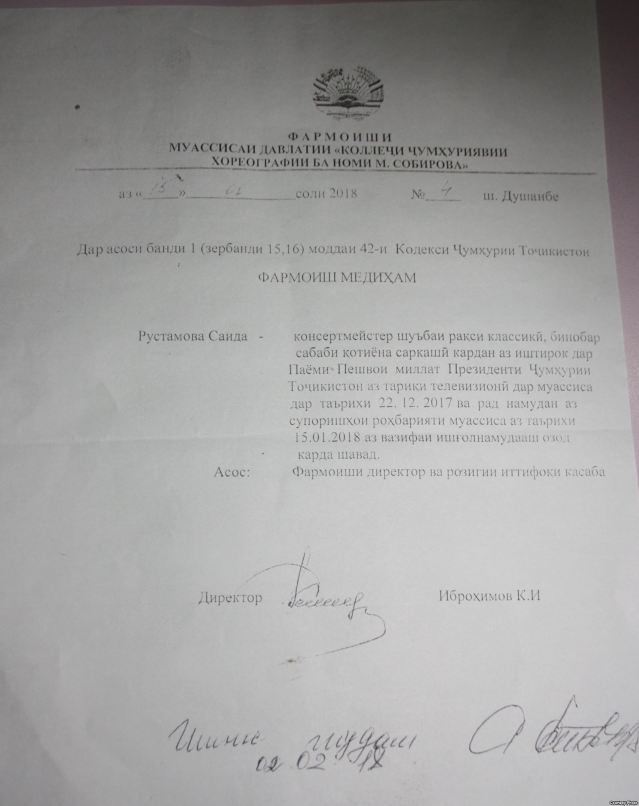 Дар фармоне бо имзои роҳбари коллеҷ Кенҷа Иброҳимов, «қотеона саркашӣ кардан аз иштирок дар Паёми Пешвои Миллат Президенти Ҷумҳурии Тоҷикистон аз тариқи телевизион дар муассиса» яке аз сабабҳои аз вазифа сабукдӯш шудани муаллима Рустамова гуфта шудааст. Ин фармонро рӯзи 15-уми январ имзо кардаанд. Нусхаи он рӯзи 14-уми феврал ба дасти Радиои Озодӣ расид.
