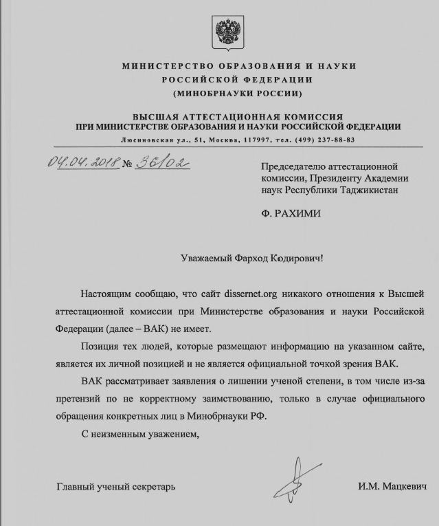 Паём: Но письмо представителя ВАК России президенту АН Таджикистана говорит о том, что ВАК замешан в диссертационной индустрии не меньше?