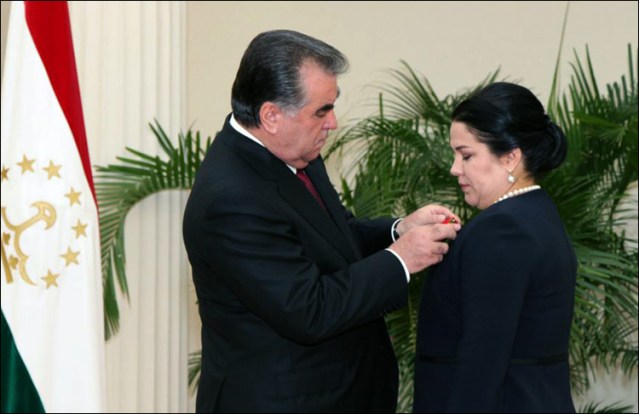 Эмомали Рахмон награждает дочь Озоду. Фото пресс-службы президента Таджикистана