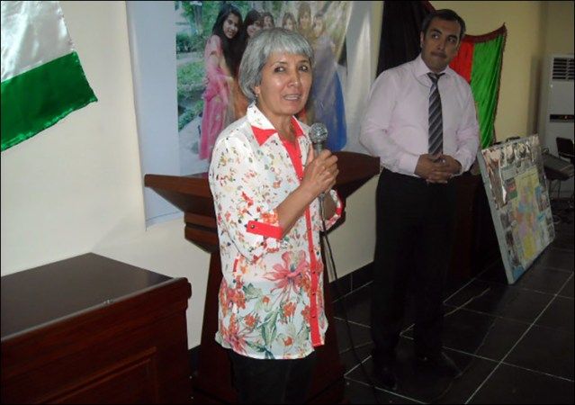Зебинисо Рустамова выступает на мероприятии, посвященном афганским беженцам, Худжанд, 2014 год. Фото из архива Камара Ахрора