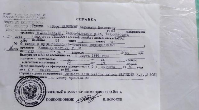 Каромат Бакоевич — бывший российский военнослужащий, уроженец Таджикистана, который проживал в этой республике до 1980 года. 20 лет он отслужил в рядах Советской, а затем Российской армии, что подтверждает справка Минобороны.