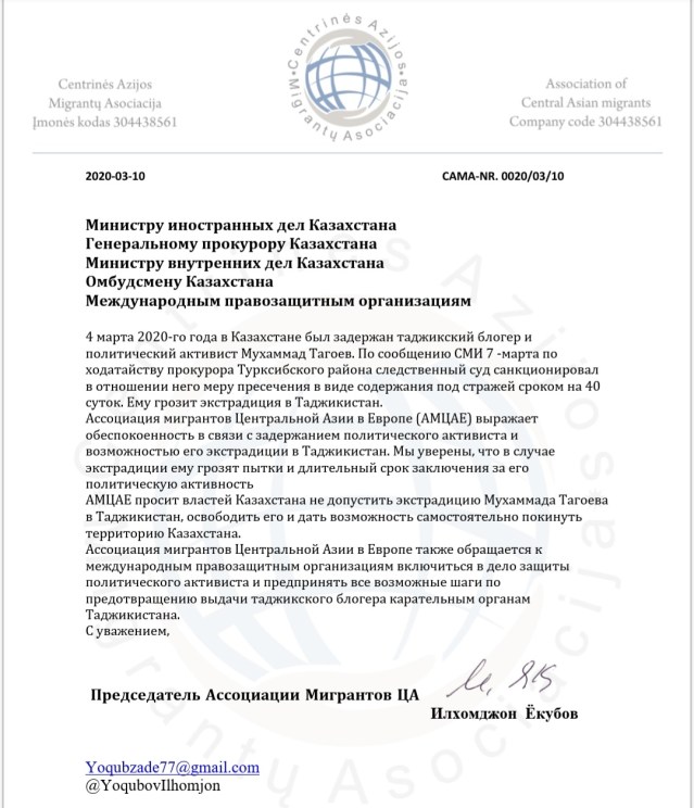 АМЦАЕ просит властей Казахстана не допустить экстрадицию Мухаммада Тагоева в Таджикистан, освободить его и дать возможность самостоятельно покинуть территорию Казахстана.