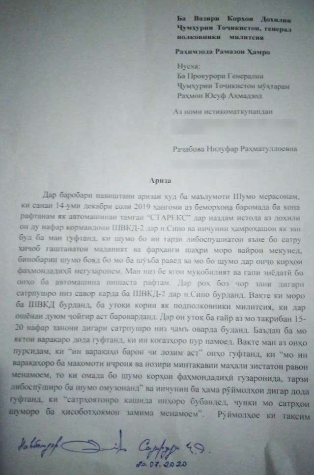 “Абдуллоева Р.Х маҷбур шудааст, оиди ҳолати мазкур ба кормандони милитсия дар ноҳияи Синои шаҳри Душанбе муроҷиат намояд. Кормандони ШВКД-2 дар ноҳияи Сино оид ба ҳолати мазкур маводҳои заруриро омода намуда, барои моҳиятан дида баромадан ба Суди ноҳияи Синои шаҳри Душанбе ирсол намуданд. 18 октябри соли 2019 суди ноҳияи Синои шаҳри Душанбе шаҳрванд Раҷабова Н.Р.-ро бо моддаи 460 КҲМ ҶТ гунаҳгор дониста, нисбаташ ҷарима ба андозаи 10 нишондиҳанда барои ҳисобҳо баробар ба 550 сомонӣ таъин намуд. Раҷабова Н.Р. ба гуноҳаш пурра иқрор шуда, маблағи номбурдаро ихтиёран супорид”, — навишта буд сомонаи хабарии ВКД.