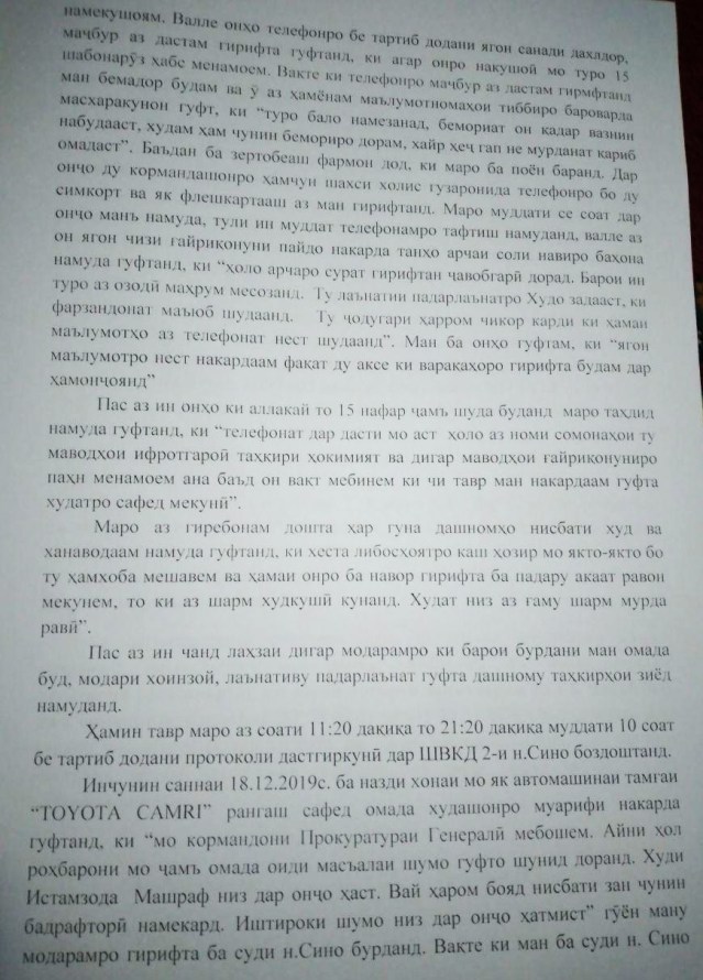а гуфтаи ӯ, дар телефони мобилияш якчанд акси ҳуҷҷатҳои тиббии фарзандони бемораш буданд. Аммо бо сабабҳои номаълум кормандони ШВКД-2 дар ноҳияи Сино то ҳол онро ба ӯ надодаанд.