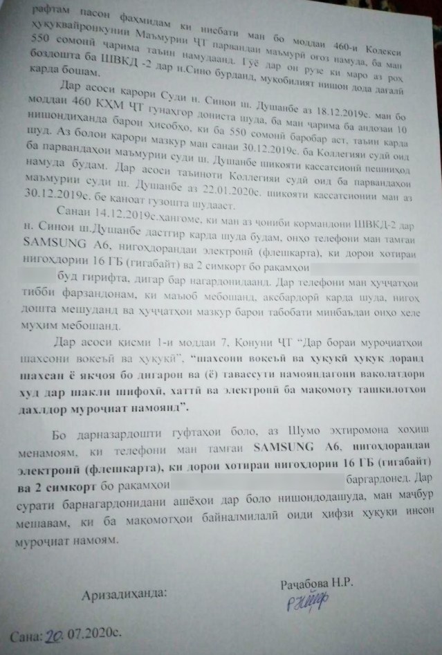 Нилуфар Раҷабова – ҷавонзане, ки 18-уми декабри соли гузашта барои пӯшидани ҳиҷоб боздошт гардида, бо иттиҳоми ҳуқуқвайронкунии маъмурӣ (майдаавбошӣ) 550 сомонӣ ҷаримабандӣ шуд, аз кормандони ШВКД-2 дар ноҳияи Сино талаб дорад, телефони мобилияшро баргардонанд.