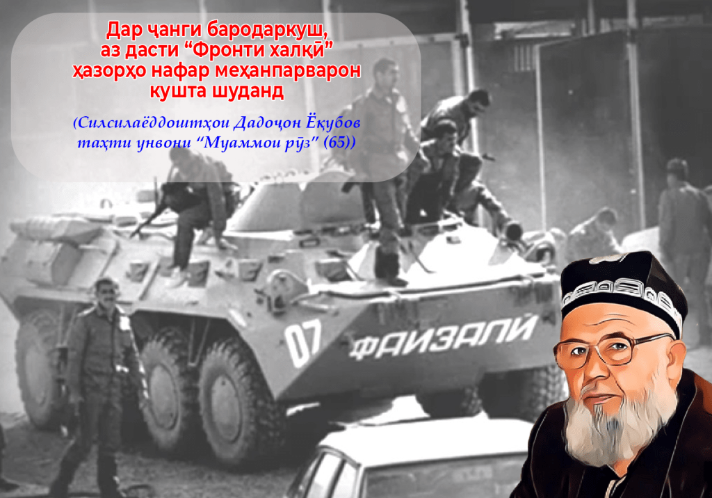 Инҷо зарур донистам лаҳзаеро аз таърихи начандон дур биёрам: бар зидди истиқлолхоҳони нухбагони миллат, бо роҳбарии дастандаркорони хориҷӣ майдони Озодиро ташкил намуданд… Бо зӯри яроқ, танку ҳавопаймоҳои хориҷӣ аз кишвари ҳамсоя ба пойтахти ҷумҳурӣ ҳуҷум карданд.