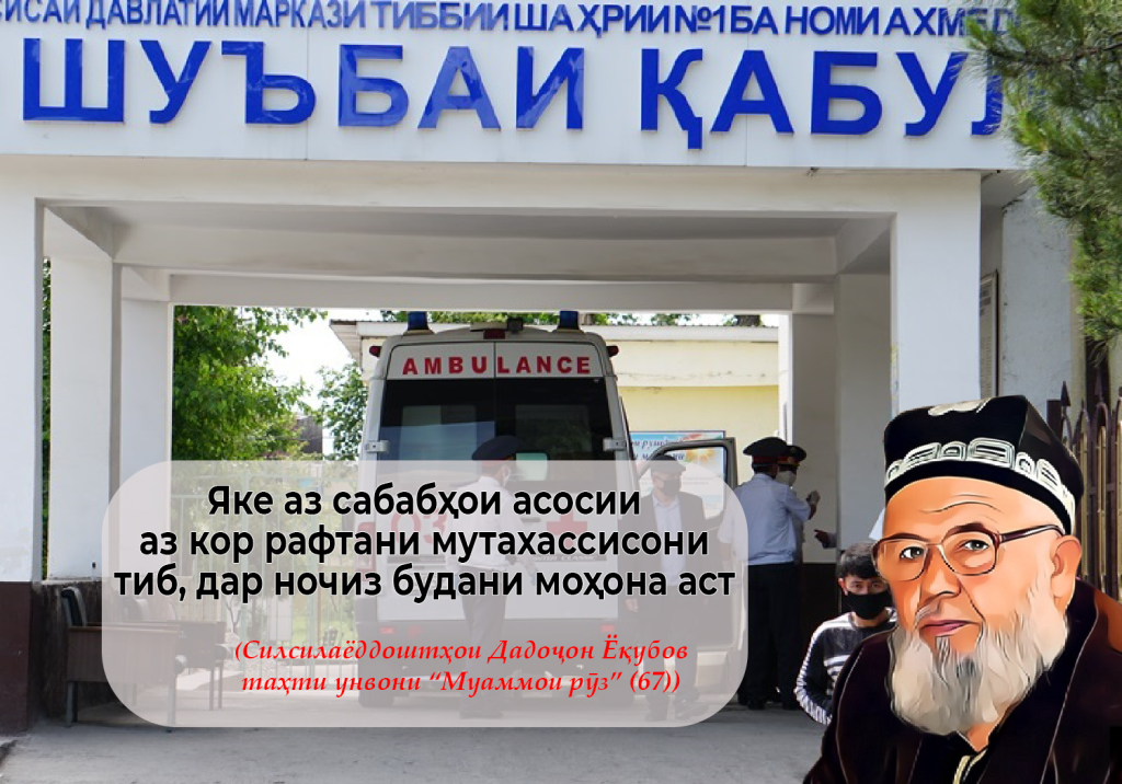 Саволе ба вуҷуд меояд, ки агар то давраи истиқлолият 65 000 нафар табибон кору фаолият дошта бошанд, боз дар тӯли 31 сол 189 000 мутахассиси тибб тайёр карда шуда бошад. Ҷамъулҷамъ 154 000 нафар мешавад. Аз ин шумора, фарз кардем 2000 нафар ба нафақа ва ё фавтиданд. Бақия 152 000 нафар мемонанд, ки аз он 87 126 нафар фаолият дошта табибонро ҳам тарҳ кунем 64 894 нафар мемонанд.