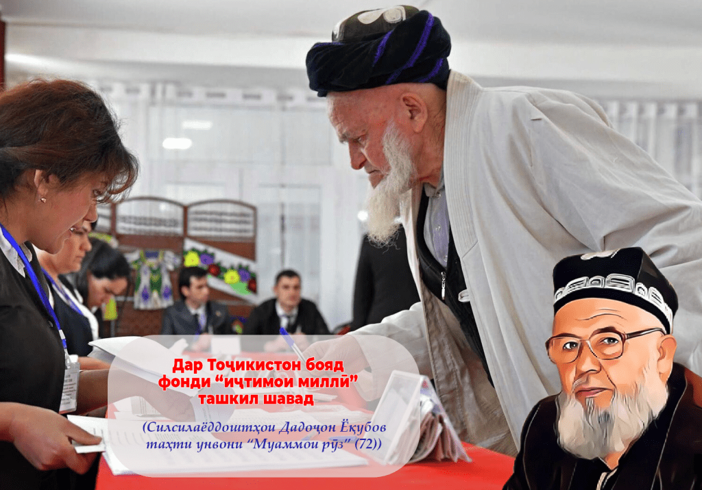 “(Барои эҷоди ҷомеаи матлуб ва зиндагии шоиста барои шаҳрвандон дар Тоҷикистон, пешниҳод мекунам) фонди “иҷтимоии миллӣ“ ташкил карда шавад, то ин фонд, ба соҳаи маориф, тандурустӣ ва ҳифзи иҷтимоӣ маблағгузорӣ намояд. Фонд дар зери итоати давлат набуда, балки як фонди ҷамъиятӣ (ташкилотӣ) алоҳидаи ба миллат гузоришдиҳанда бошад. Захираи фонд аз ҳисоби сарчашмаҳои хусусӣ, давлатӣ ва кӯмаки созмонҳои байналмилалии хайриявӣ ташкил карда мешавад…”