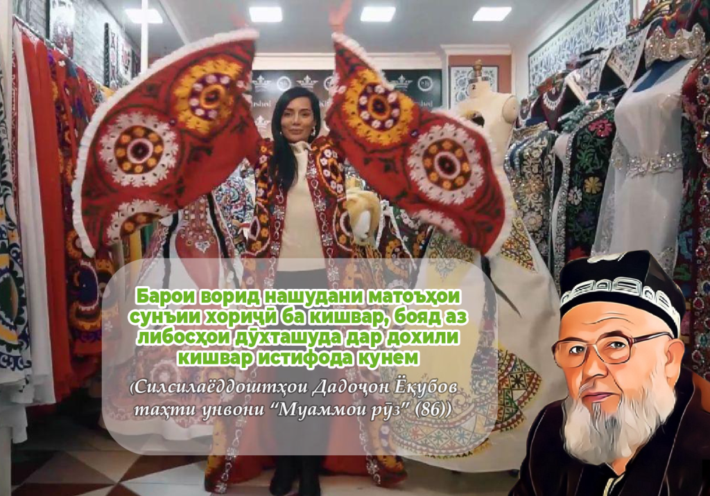 Дар шаҳру ноҳияҳо то 60 -70%-и либоси занона дар дохили кишвар дӯхта мешавад, ки ин амали нек аст. Ҳамзамон қайд намудан зарур аст, ки истеҳсоли маҳсулоти пахтагин ва шоҳӣ (атлас) бо истифода аз пахта ва пилла боис мешавад, ки матоъҳои сунъии хориҷӣ камтар ба кишвар ворид карда шавад.
