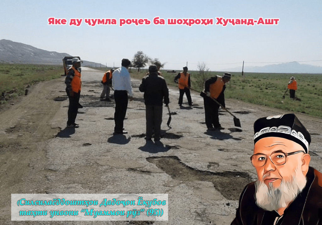“Барои асфалтпӯш намудани байни роҳи Ашт-Хуҷанд, ки 70 км ба тӯл мекашад, масъулони ноҳияи Ашт аз ҳисоби пули аҳолии ноҳия даст ба кор шуданд. Сохтан ва обод кардани роҳ хеле савоби калон ва амали нек аст, вале ин роҳ таъмири капиталӣ мехоҳад, аз ҳисоби мардуми маҳаллӣ таъмир ва обод кардани он, хеле мушкил ва ё имконнопазир аст…”