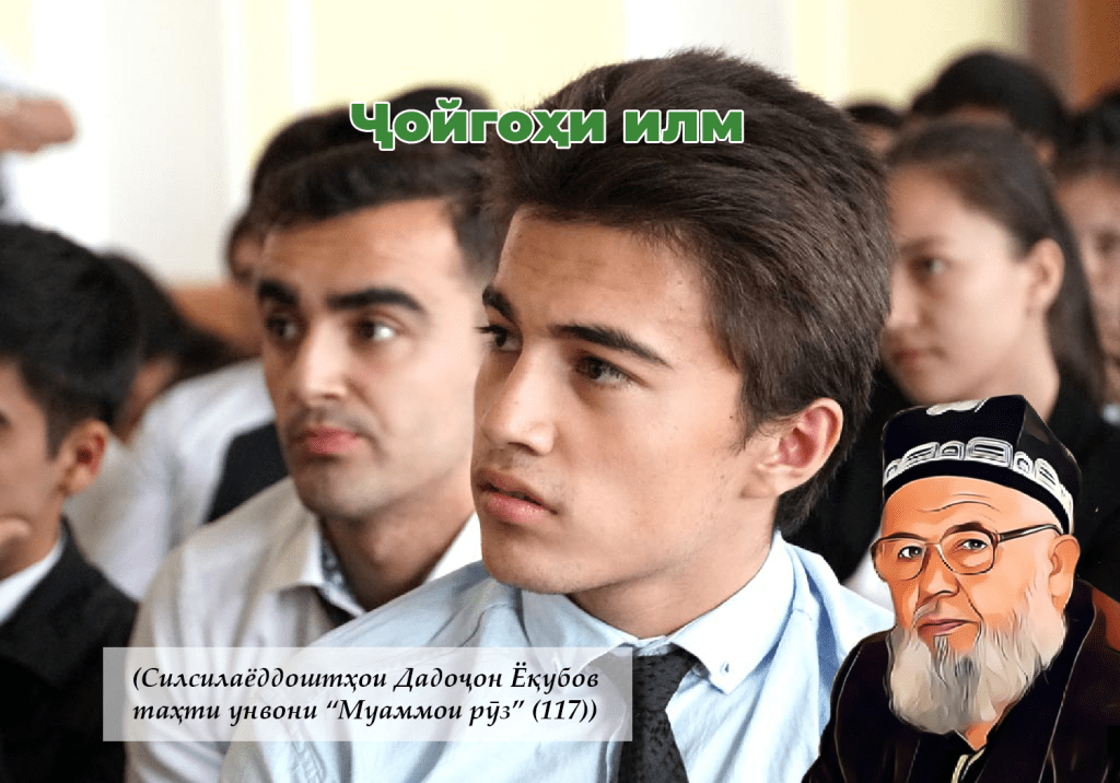 “Ҳар кас барои талаби илм роҳеро ихтиёр кунад, парвардигор роҳи ҷаннатро ба ӯ осон месозад. Ҳамоно фариштагон болҳои худро бар толибони илм мегустаронанд. Тамоми аҳли осмонҳову замин, ҳатто наҳанг дар қаъри баҳр барои марди донишманд аз Худо истиғфор металабад. Фазли олим бар обид, ҳамчун фазли маҳтоб дар шаби чаҳордаҳ бар соири ситорагон аст. Олимон ворисони паёмбаронанд, ки онҳо на динору дирҳам, балки илмро мерос гузоштанд.“ (ривояти Имом Тирмизӣ, ҳадиси 1388/13)