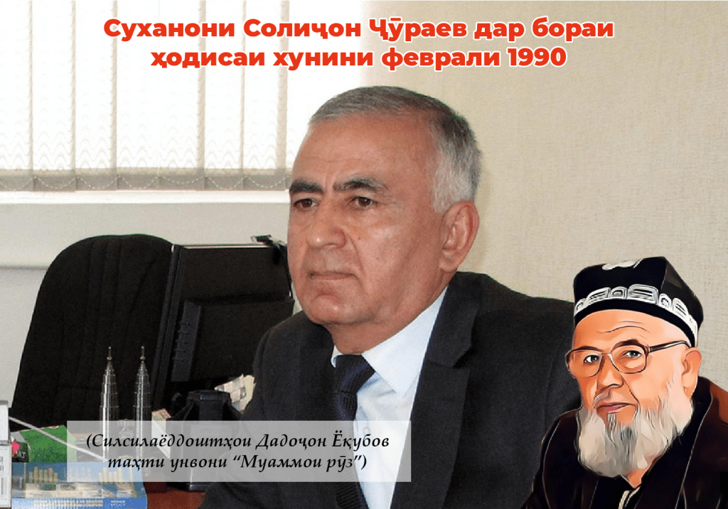 “Пас аз 20 сол ҷонишини вазири ВКД — и ҶШС Тоҷикистон Николай Шентсев ба бетартибиҳои оммавӣ ва ҳамла ба бинои КМ ҲК Тоҷикистон ва Шӯрои Вазирон, аз тарафи издиҳоми хашмгини аслиҳа доштаро, аз тарафи сарбозони нерӯҳои махсус, ки аз Маскав омада буданд, 25 ошӯбгари мусаллаҳро тирборон карданд…” Инҷо, ӯ маҳз дурӯғ мегӯяд, ки 25 ошӯбгари мусаллаҳро тирборон карданд.